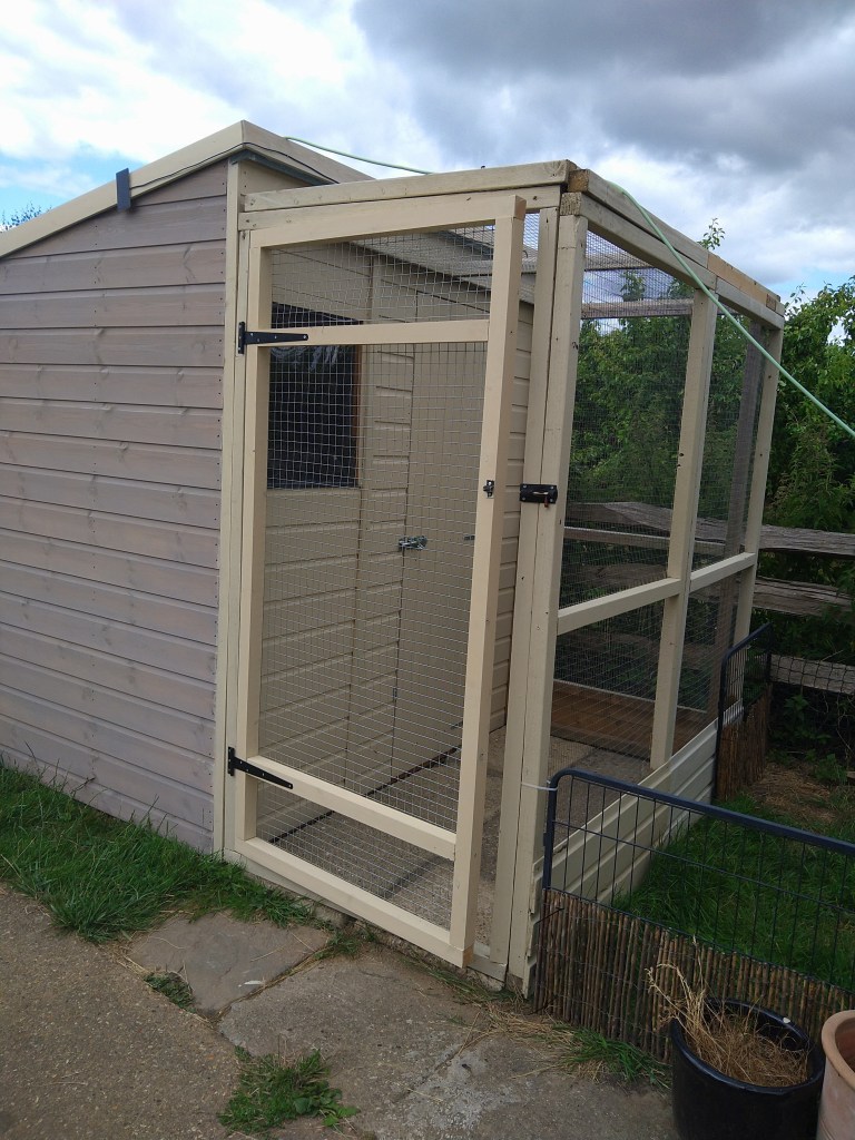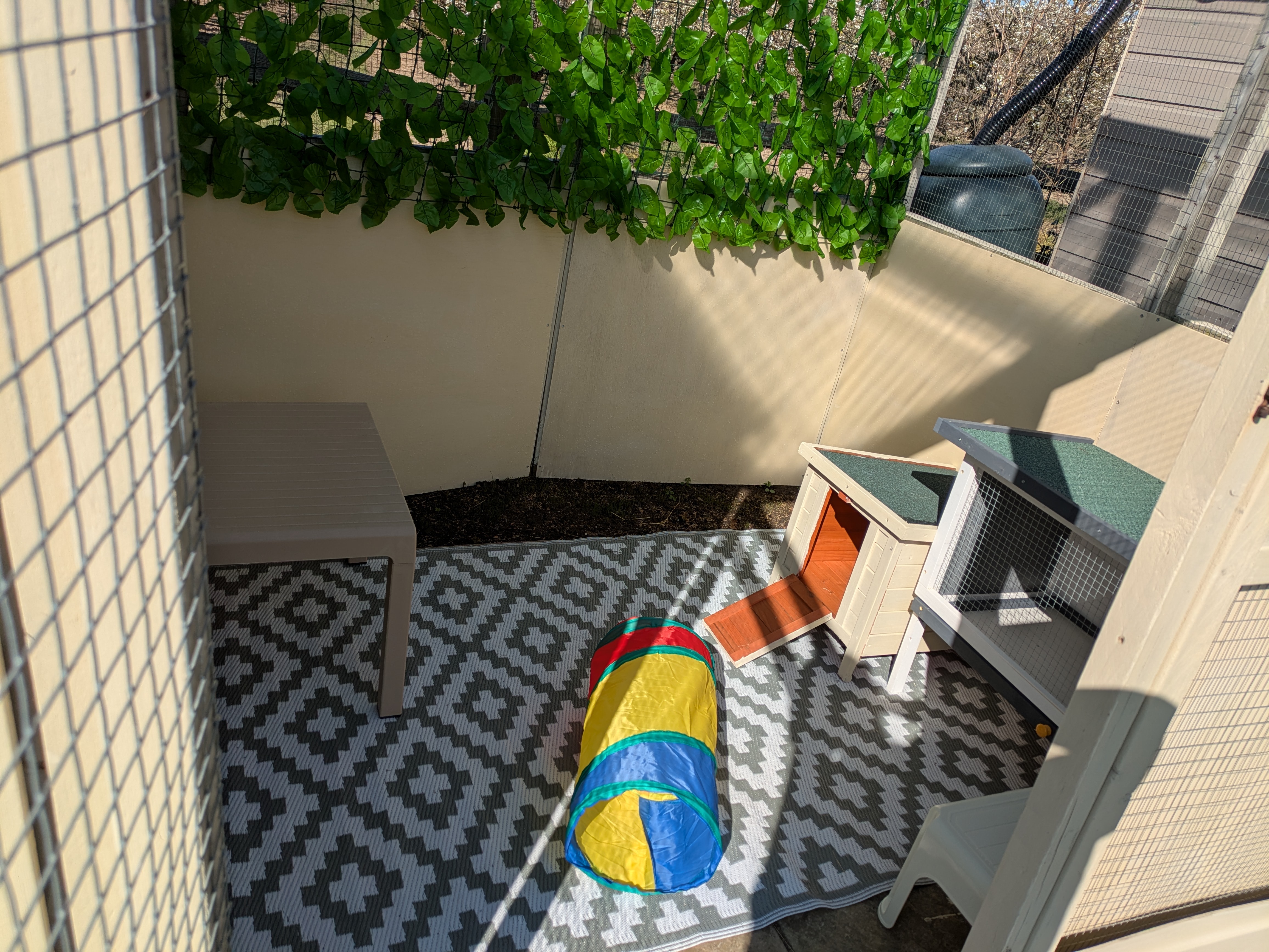 Our outdoor aviary is 36sq ft and available April – October for bunnies who usually live outside. The sides can be covered during wet weather and we have reflective sun shades for the summer. The space is for 24/7 use.
